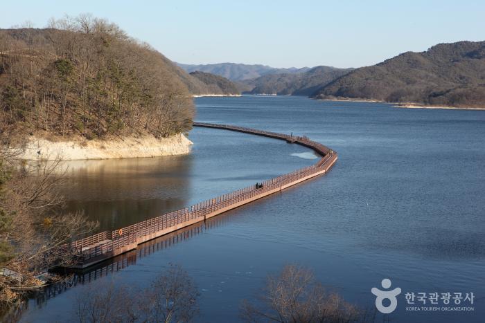 선성현문화단지 입구에서 호수로 내려가면 선성수상길이다. 수위에 따라 뜨고 가라앉는 부교가 1km 이어진다(왕복 40분 소요). 물 위를 걷듯 사뿐사뿐 걷다 보면 안동호반 자연휴양림과 만난다. 아름다운 이 길은 안동선비순례길 9개 코스 중 1코스에 해당한다. 부교 중간쯤 풍금과 책걸상이 놓였다. 수몰된 예안국민학교가 있던 자리다. 1974년 안동댐을 만들면서 마을관 함께 잠기게 되자 현재의 한국국학진흥원 옆으로 옮겼다가 학생이 없어 폐교됐다.