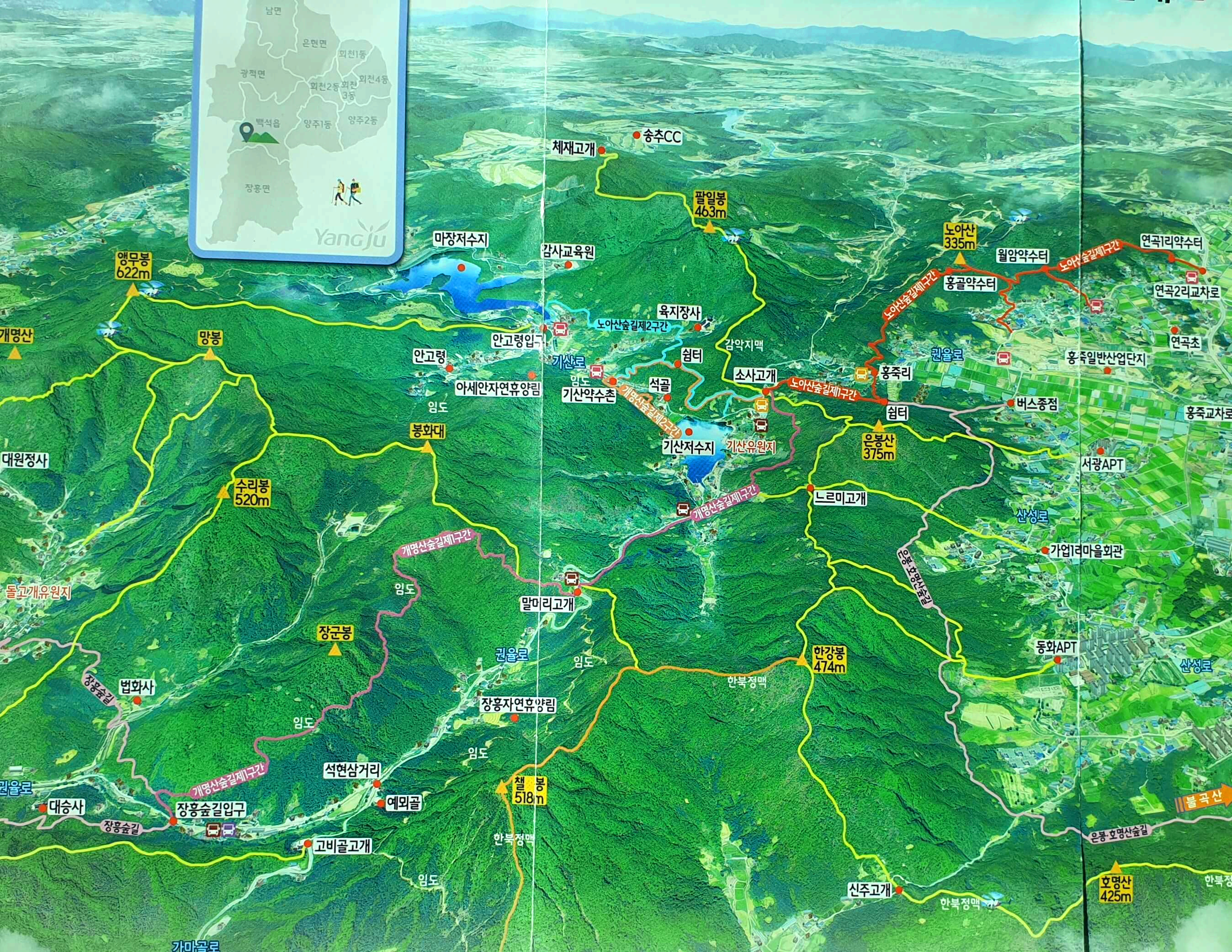양주시청 -> 별산대놀이마당 -> 임꺽정생가터 -> 선유동천 쉼터 -> 대교 APT 앞 -> 김승골 쉼터 -> 광백저수지(전망대) -> 8사단