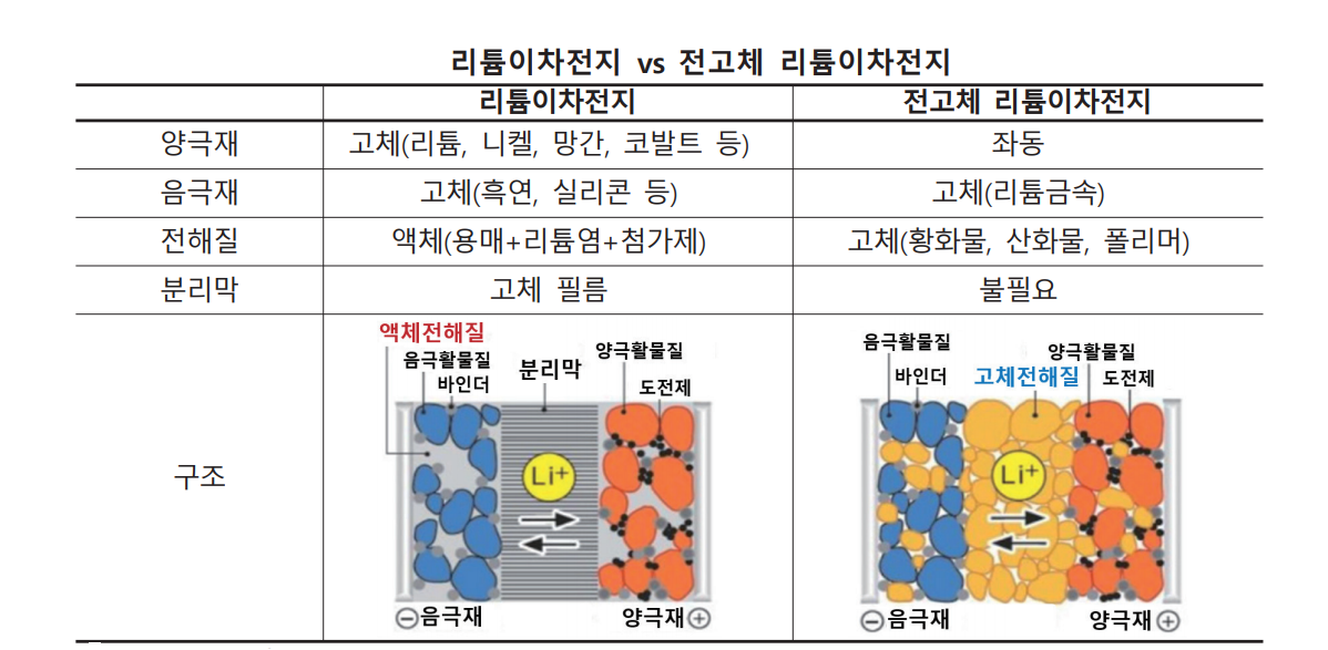 스마트폰이나, 전동공구, 전기차에 사용하는 배터리는 대부분 리튬이온배터리로 양극, 음극, 분리막, 전해질로 구성되어 있다. 전고체 배터리는 양극과 음극을 오가며 전기를 발생하는 액체 상태의 전해질을 고체로 바꾼 것이다.