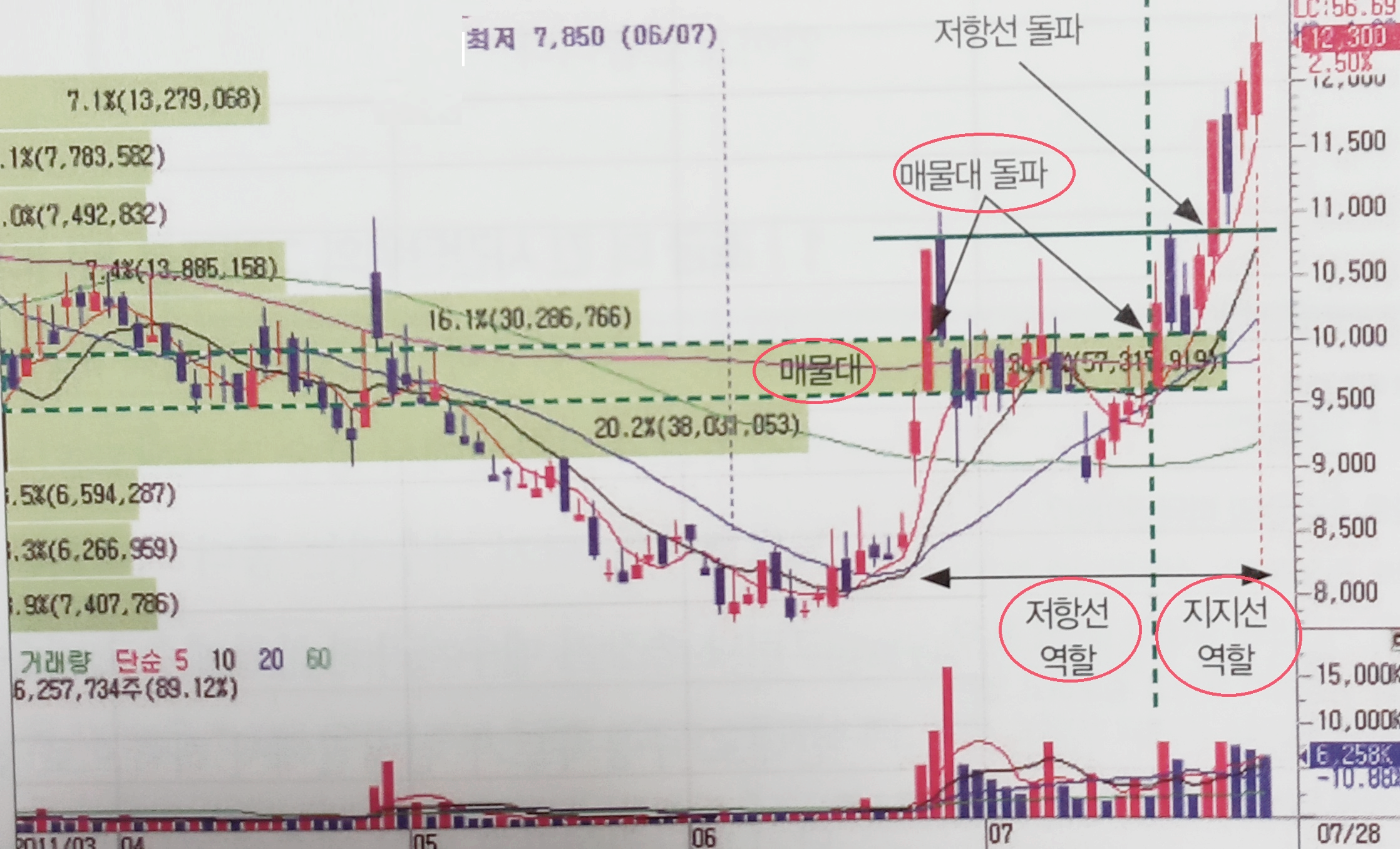 5개월의 거래량 중 9,600원~10,050원에서 전체 거래량의 30.4%가 거래되어 매물대가 형성되어 있다. 주가가 6월 27일 1차 돌파하였으나 실패하고 7월 19일에 종가 10,300원을 기록하면서 2차 돌파에 성공했다. 매물대를 돌파한 주가는 1만 원 주가를 지지선으로 하고 7월 25일에는 직전 저항선인 10,700원을 강하게 돌파하면서 추가 상승을 예고하고 있다. 7월 19일 기준으로 저항선 역할을 했던 매물대가 지지선으로 바뀌게 된 것이다.