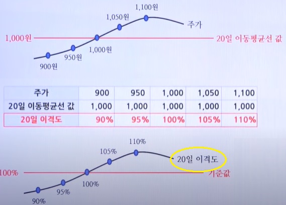 20일 이격률 = (주가 ÷ 20일 이동평균지수) x 100