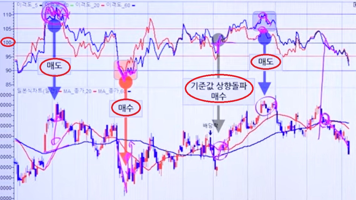 *이격도가 일정 수준 이상이거나 이하에서 변곡점이 나타나거나 기준값을 돌파하면 매수, 매도 시점이 온 것으로 본다.