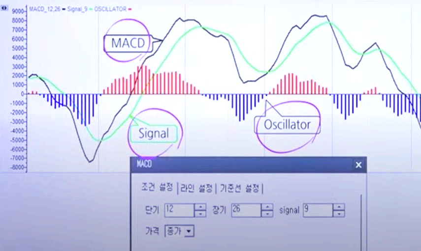 0(기준선)을 기준으로 움직이는데 0이 되는 시점이 본 차트에서 12일과 26일이 교차하는 시점(그림참조)