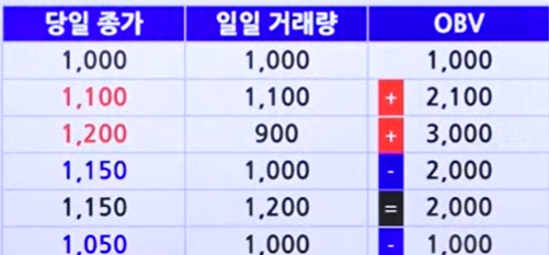 거래량으로 계산한다. 전일대비 주가가 상승한 날의 거래량은 OBV에 더하고 하락한 날의 거래량은 OBV에서 빼는 방식이다.