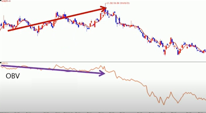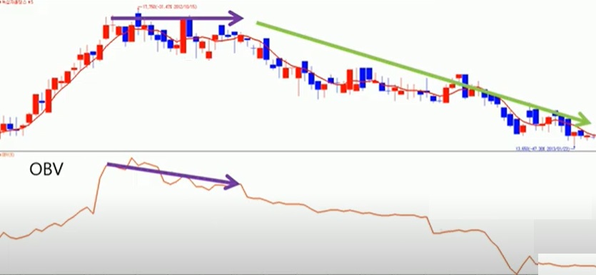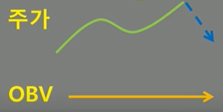 ● 주가가 계속 상승하고 있지만 OBV는 직전 고점 아래에서 횡보하거나 하락할 경우->주가 하락 예상