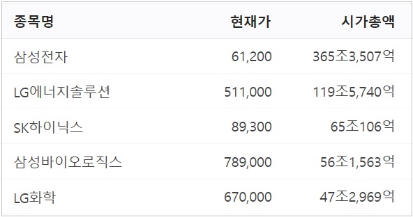 현재 국내 시가총액 상위종목 TOP5▽
