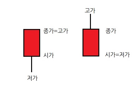 강한 양봉 : 아침시가부터 시장이 끝날 때까지 강한 매수세력이 계속 들어와 주가가 상승으로 끝났다는 뜻입니다.