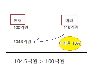 현재가치와 미래가치를 비교할 때 현재 100억 원은 투자에 들어가는 비용이니까 '비용'이라 볼 수 있고, 104.5억 원은 투자를 해서 들어올 돈이니까 '수익'이라 볼 수 있다. 그래서 현재의 비용과 미래의 수익을 현재가치로 할인하여 비교함으로써 투자를 결정하게 된다.