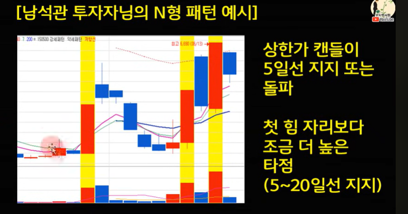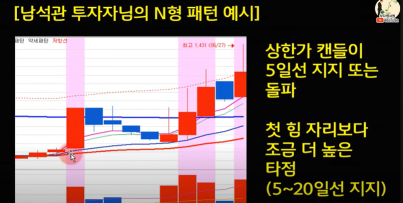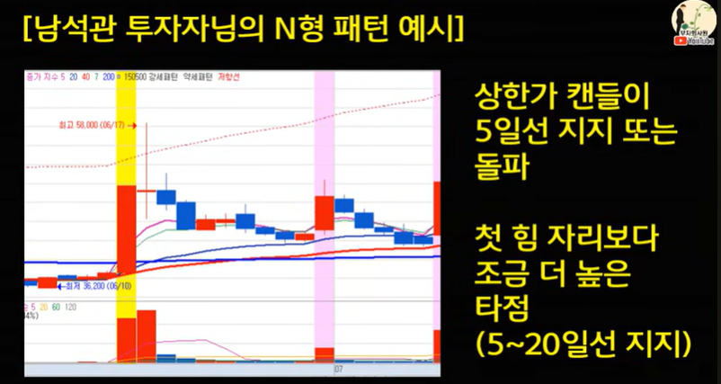 이격이 많이 높지 않은 상태, 즉 가격이 많이 떠 있지 않은 상태에서 5일, 10일선이 지지하는 가운데 어제 상승, 오늘 하락, 내일 상승하는 패턴이다.