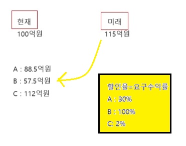 B : 100% 요구 수익률(할인율), 115 / (1+1) ¹ = 57.5억 원