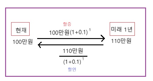 미래 1년, 현재가치 : 110만 원 / (1+0.1) ¹ = 100만 원