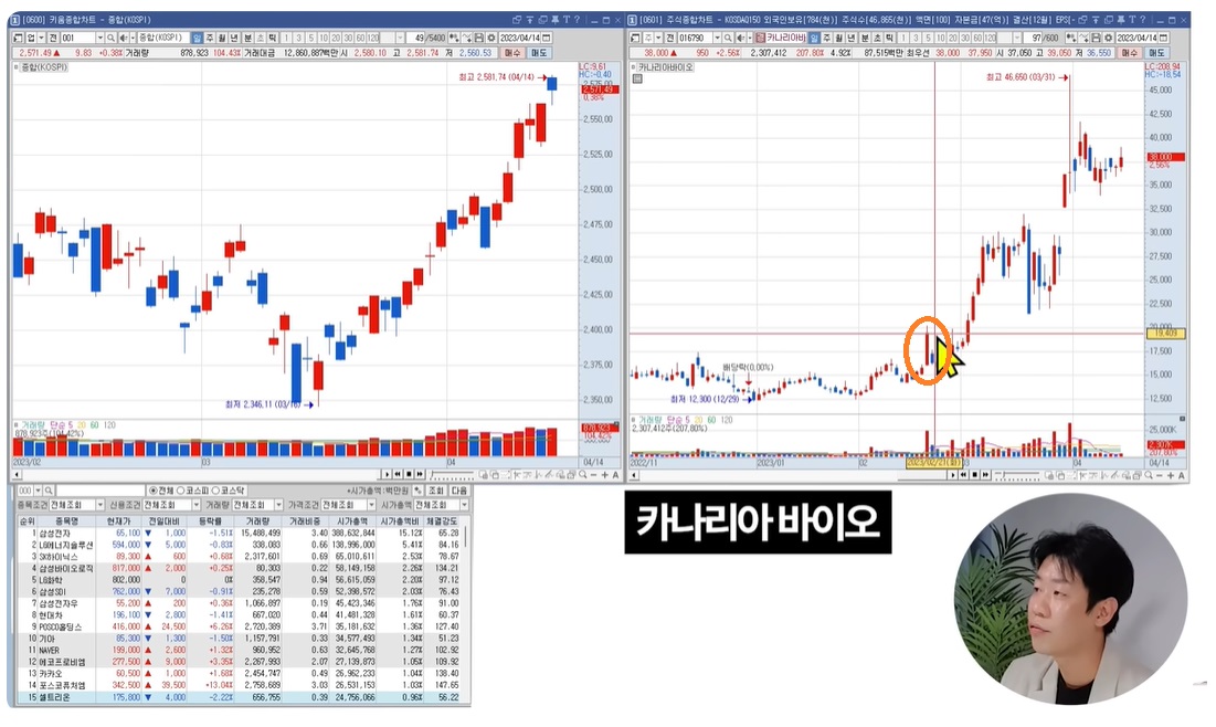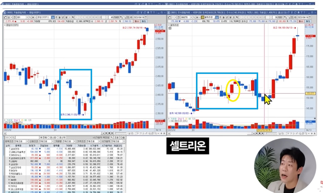 김종봉 투자자는 2차 전지에서 분명히 손바뀜이 일어날 것이라 생각하였고 다음 섹터가 나올 것이라고 계속 생각하고 있었다고 한다. 그 종목이 셀트리온이었다. 셀트리온의 경우도 지수를 이기고 있었다. 아래 차트를 보면 지수는 3월 7일까지 올렸다 내렸고 전고점 돌파를 못했지만 셀트리온은 빠지지 않고 바로 올렸다. 이때 지수보다 훨씬 강하다는 생각을 했다. 셀트리온이 바이오주고 바이오주들 중에 이때 가는 종목이 있었는지 찾아보았다. 그때 찾았던 종목이 박셀바이오였다. 비슷한 시기에 급등을 했고 지수보다 강하다고 생각해서 매수하게 되었다. 카나리아바이오 또한 지수보다 강해서 매수를 하게 되었다. 이런 식으로 바이오주들로 손바뀜이 일어나겠구나 라는 생각을 계속했고 이 시기에 60% 정도는 바이오주들로 매수를 했었다고 한다.