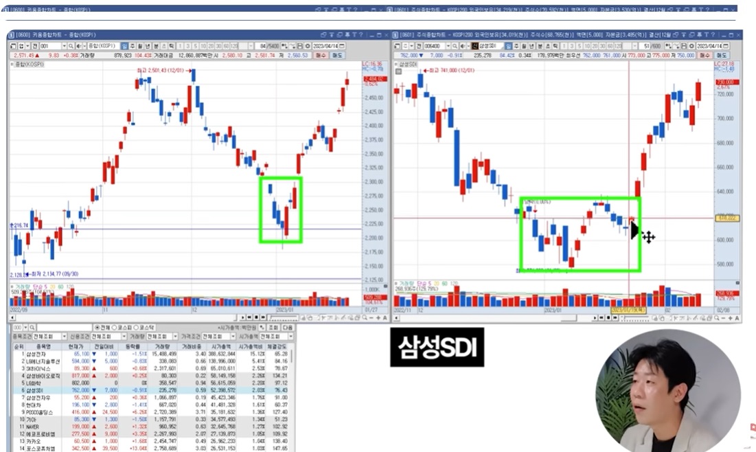 시가총액 1위부터 20위까지 보면 대부분의 섹터들이 다 나온다. 그래서 이 섹터들 중에 힘이 가장 센, 지금 시장을 이기는 종목들을 찾고 그 종목에서 관련된 업종들이 무엇인지 찾아내는 것이 매우 중요하다. 그리고 종목을 선택할 때 중요한 것이 거래 대금이 최소 천억에서 2천억 정도는 나와야 한다. 그 천억에서 2천억 정도 나온 종목들 중에 가장 재무 재표가 좋은 종목이 대장일 가능성이 크다. 보통 텐베거라던지 10배 가는 종목들은 대부분 제일 초반에 천억, 2천억의 거래대금이 들어오고 시장을 이기면서 그 섹터들이 다 같이 오르는 경우가 많다. 2차 전지의 경우가 그렇다. 에코프로비엠이 직전 고점을 돌파할 때 거래대금이 2천억이 넘었고 시장을 이겼다. 이런 종목들이 눌림이 나오면 매수를 하는 것이 좋다.