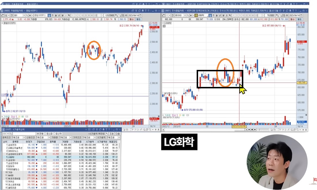 지수가 상승해야 주도주가 더 많이 생길 것이고 매수를 할 수 있는 여력이 더 많이 생긴다. 지수가 올라야 확률이 높아진다. 지수가 언제 오르고 내릴지는 삼성전자로 판단한다. 삼성전자가 언제 지수를 이겼는지 살펴본다. 아래 차트에서 삼성전자가 지수를 이긴 날이 3월 23일 목요일이다. 지수는 직전 고점을 돌파하지 못했는데 삼성전자는 강하게 돌파한 게 보인다. 그러면 지수가 앞으로 상승하겠구나라고 판단할 수 있다. 그러면 앞으로 무슨 종목을 사야 하지 고민하게 될 것이다. 이때 삼성전자가 지수보다 강했기 때문에 삼성전자를 사도 되고 아니면 시가총액 상위 종목 리스트를 보고 시총 2위부터 한 번씩 클릭해 보고 지수를 이기고 있는 종목을 찾아봐도 된다.