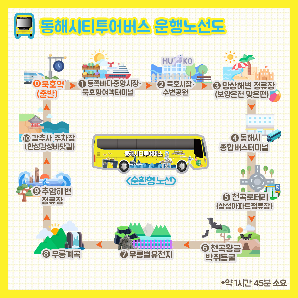 첫차는 묵호역을 오전 9시 45분에 출발, 주요 관광지를 총 7회씩 순환하며, 마지막 7회 차는 오후 6시에 묵호역을 출발해 천곡 로터리까지 운행한다. 원하는 관광지에 내렸다가 시간에 맞춰 다시 시티투어 버스를 탑승하면 된다(탑승권 팔찌를 착용하고 있어야 재 탑승가능하다. 처음에 버스에 탑승하면 문화해설사님이 주신다).