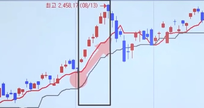● 기준선까지 지지받던 주식이 전환선에서 지지받으며 상승하면 상승속도가 빨라진다.