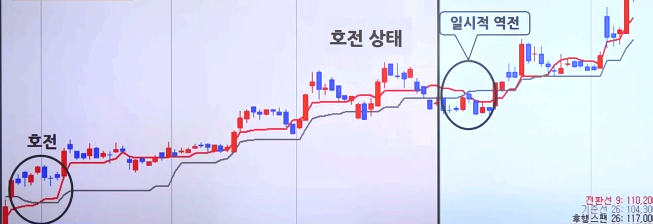 ● 호전상태(전환선이 위에 있고 기준선이 아래 있는 상태)에서 일시적으로 다시 역전되어도 기준선이 하락으로 변하지 않는 이상 매도로 전환하지 않는다.