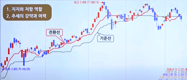 기준선이 과거 26일의 고가와 저가의 중간값이라면 전환선은 과거 9일간의 고가와 저가의 중간값으로 기준선보다 좀 더