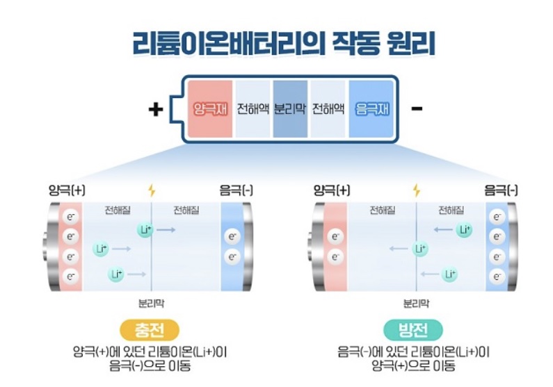 2차 전지 안에서 전기를 만들어 내는 구조는 이온이 음극에서 양극으로 이동을 할 때 전기가 생긴다. 음극에 있던 이온이 다 양극으로 가서 달라붙으면 배터리가 0%가 된다. 그리고 충전을 하면 양극에 붙어있는 이온을 다시 음극으로 되돌려 주는 데 음극에 가서 다 달라붙으면 배터리가 100%가 된다.
