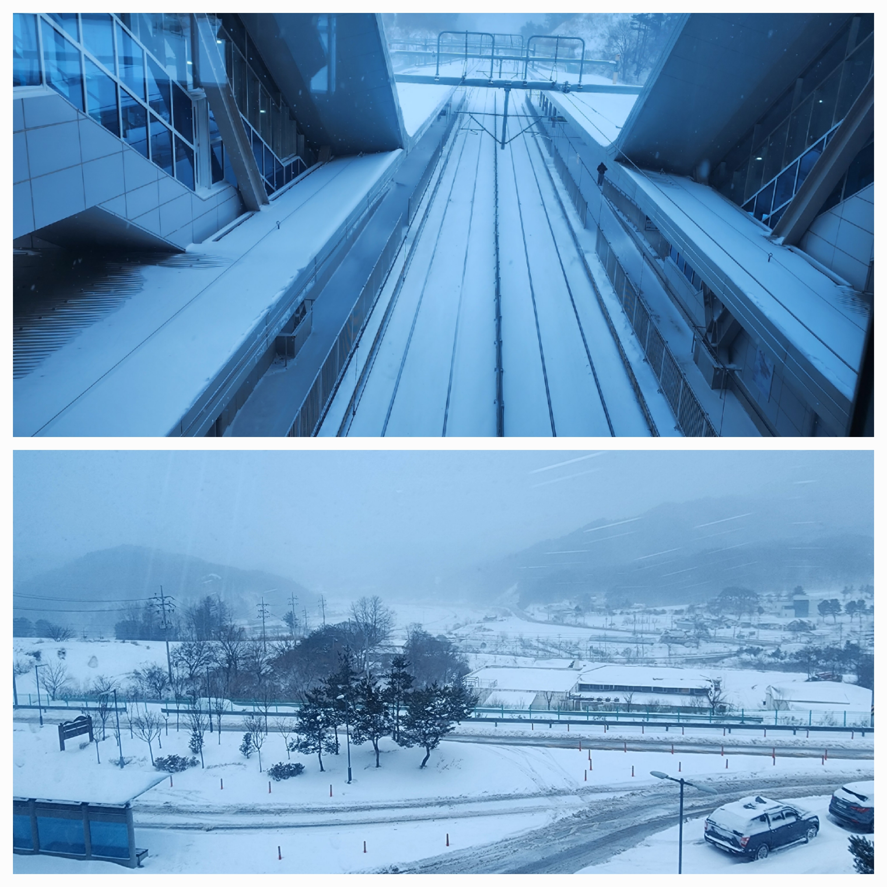 집으로 돌아오는 날은 쓸데없는 걱정 말고 정신 차리라는 듯 거친 눈보라가 나를 때린다. 엄청난 눈폭탄에 집에 돌아갈 수 있냐 마냐의 고민만 하고 있었다. 다음날 시댁에 가야 하기에 예매한 기차를 꼭 타야 했다. 도로에 눈이 너무 많이 쌓여 엄마가 운전해서 기차역까지 데려다 주기엔 위험해 보였다. 그래서 급하게 택시를 불러 일찍 기차역으로 향했다. 눈이 어찌나 내리는지 기차는 20분 정도 연착되었다. 무사히 온 것만 해도 다행이다..