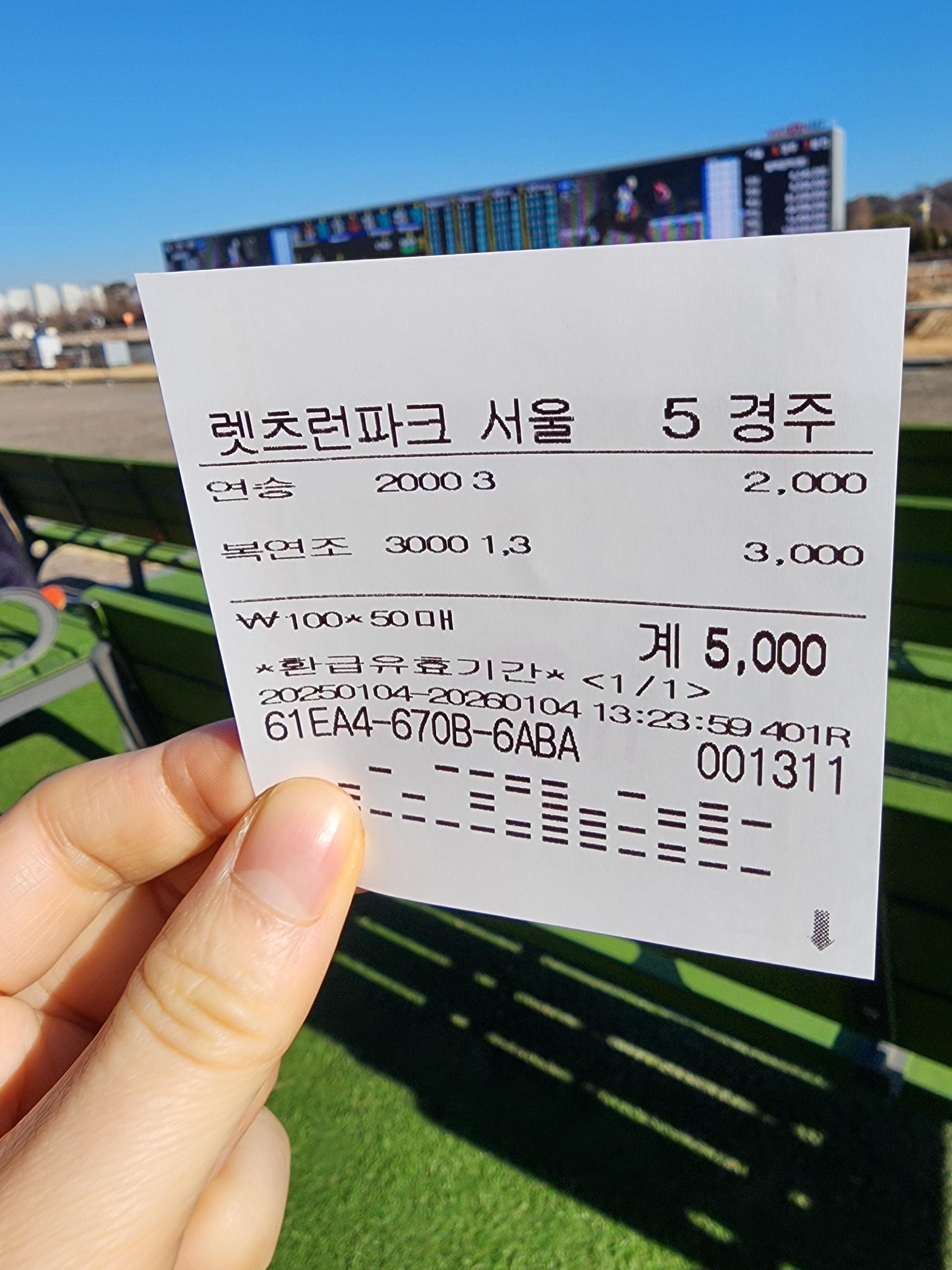 오늘은 아이와 경마장에 갔다. 작년에 한 번 데려간 적 있었는데 재밌었는지 오늘 또 가자고 했다. 날이 많이 추운 것 같아 나가기 싫었지만 집에 있으면 게임만 할 거 같아 데리고 나갔다. 다행히 생각보다 날씨는 춥지 않았다.