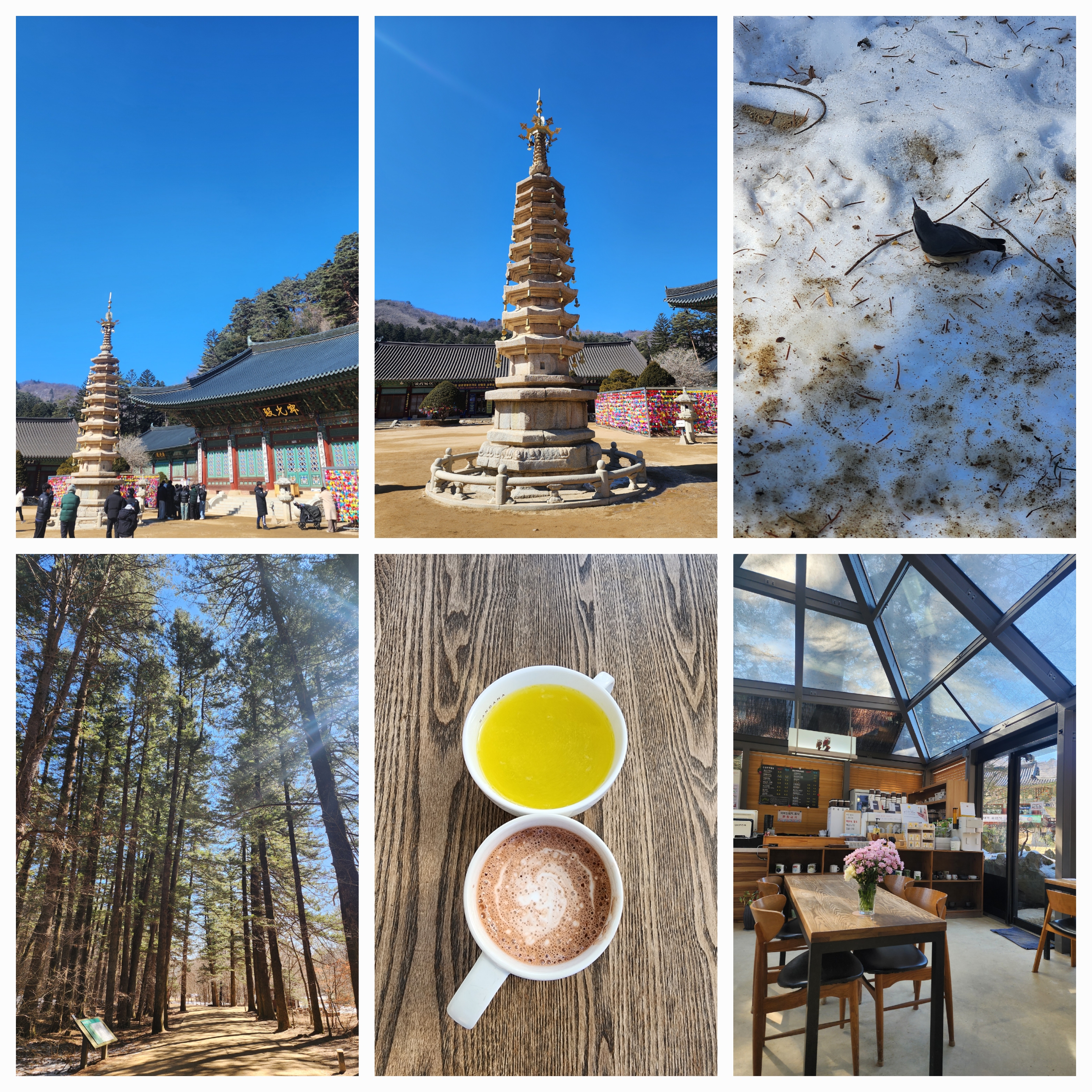 다음날 금요일엔 월정사 절에 다녀왔다. 고요한 절에 가면 마음이 편안해진다. 주말엔 사람이 너무 많아 평일에 가는 게 좋다. 역시나 사람이 많지 않았고 고요한 전나무 숲길을 걸으니 저절로 힐링이 되었다. 숲길 한 바퀴 돌고 카페에 들러 차를 마시며 잠시 몸을 녹였다. 카페가 모두 창으로 되어있어 자연을 한껏 느끼며 쉴 수 있어 좋았다. 요즘에 진로에 대해 고민이 많아 머리가 복잡한데 잠시나마 뇌를 쉬게 하는 시간이었다. 집으로 돌아와 떡볶이 해 먹고, 잠깐 낮잠도 자고, 저녁으로 샐러드와 목살 구워서 먹고 tv 보며, 이야기하며 하루를 보냈다.