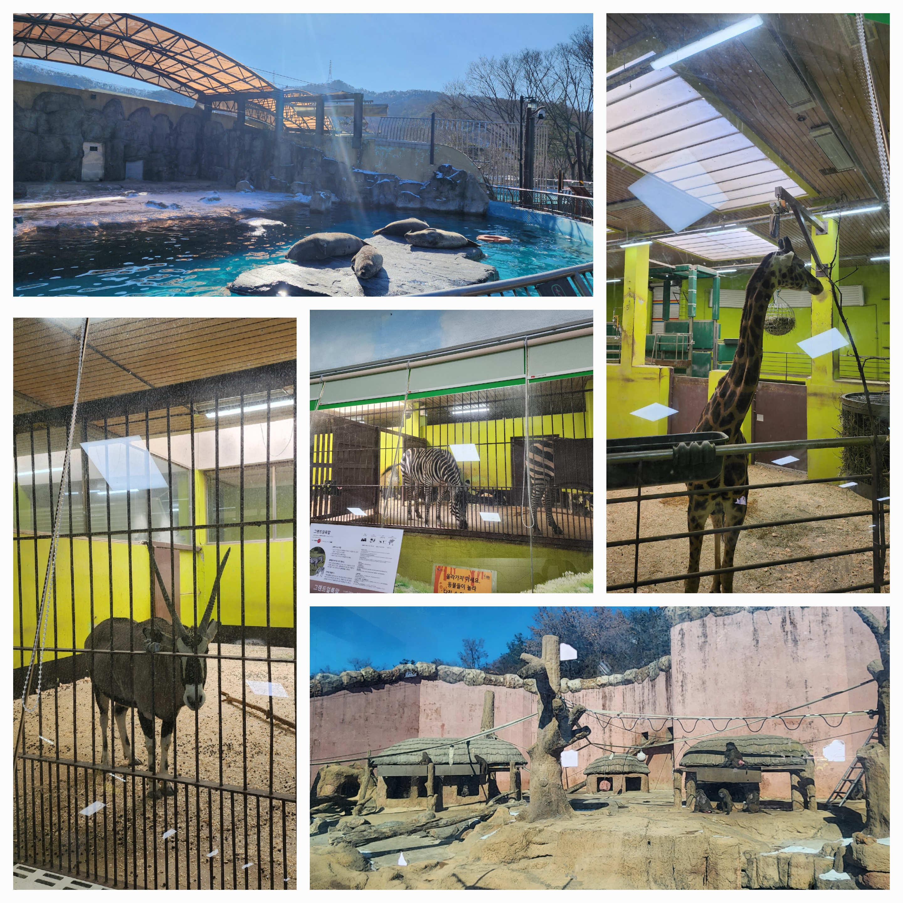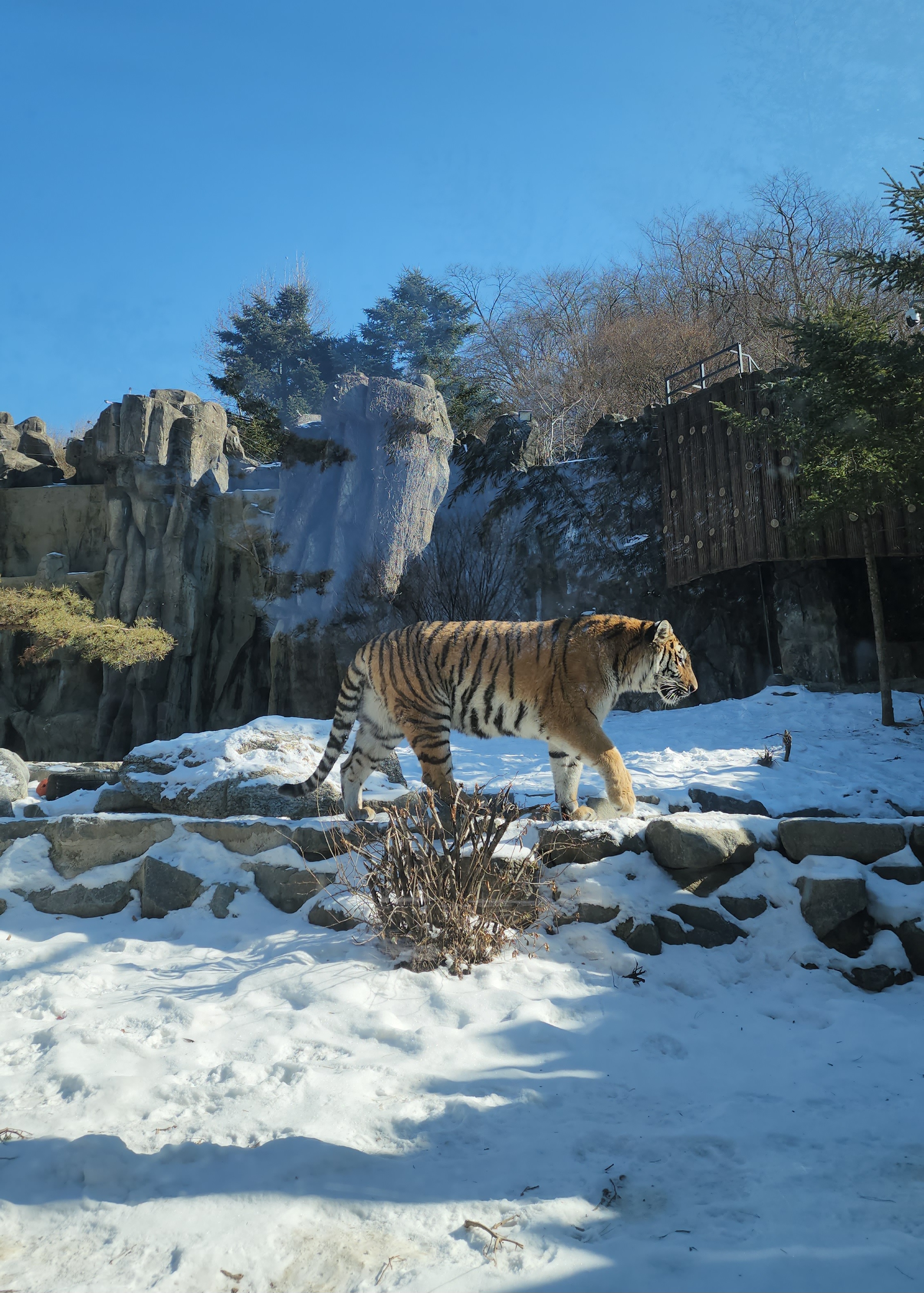 겨울이라 밖에서 볼 수 있는 동물들이 많지 않았지만 실내에서도 관람할 수 있게 되어있어 오히려 더 가까이에서 잘 볼 수 있어 좋었다. 볼 때마다 신기한 동물들.. 유리창 하나 사이로 보는 사자는 공포 그 자체였다. 통통통 튀어 다니는 귀여운 점박이 물범, 창문에 찰싹 붙어 우리를 빤히 쳐다보던 오랑우탄, 그중에 압권은 역시 호랑이다. 눈 위에 서있는 호랑이의 모습은 눈을 뗄 수 없을 정도로 압도적인 카리스마가 느껴졌다. 어흥하는 소리 하며 한참을 넋을 잃고 구경했다.