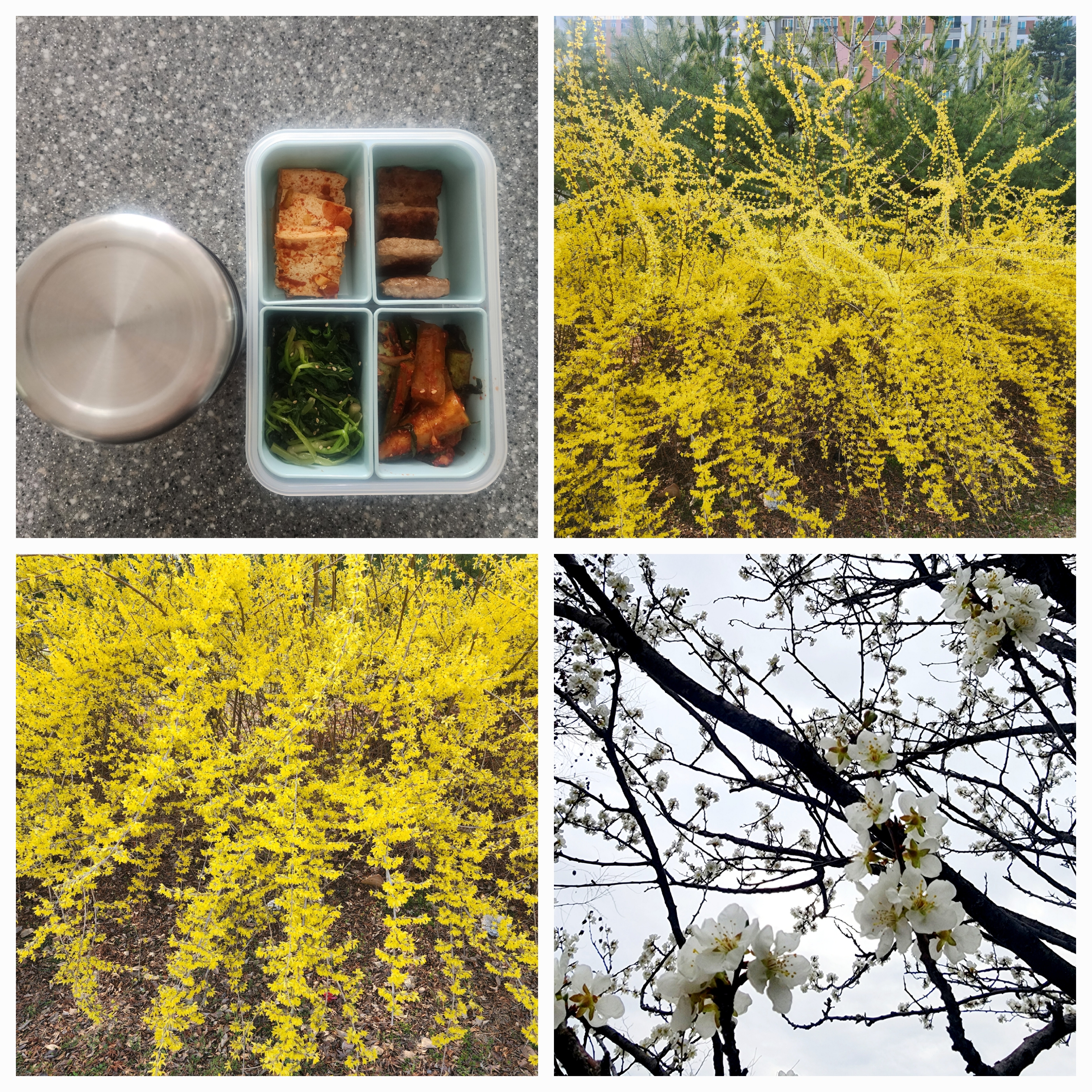 오늘은 진정으로 봄의 따뜻함이 느껴지는 날이였다. 어제까지는 바람 불고 조금 쌀쌀한 느낌이었던 것 같은데, 오늘은 아침부터 햇살이 따뜻했다. 자전거로 출근할 때 보이는 하천 풍경들이 평화롭다. 따뜻한 햇살, 알록달록한 꽃들, 새소리, 물 흐르는 소리가 마음을 편안하게 한다. 아침엔 자전거 타는 사람도 거의 없어 홀로 온전히 이 풍경을 즐긴다. 몸은 지치지만 마음만은 생기가득한 계절이다.