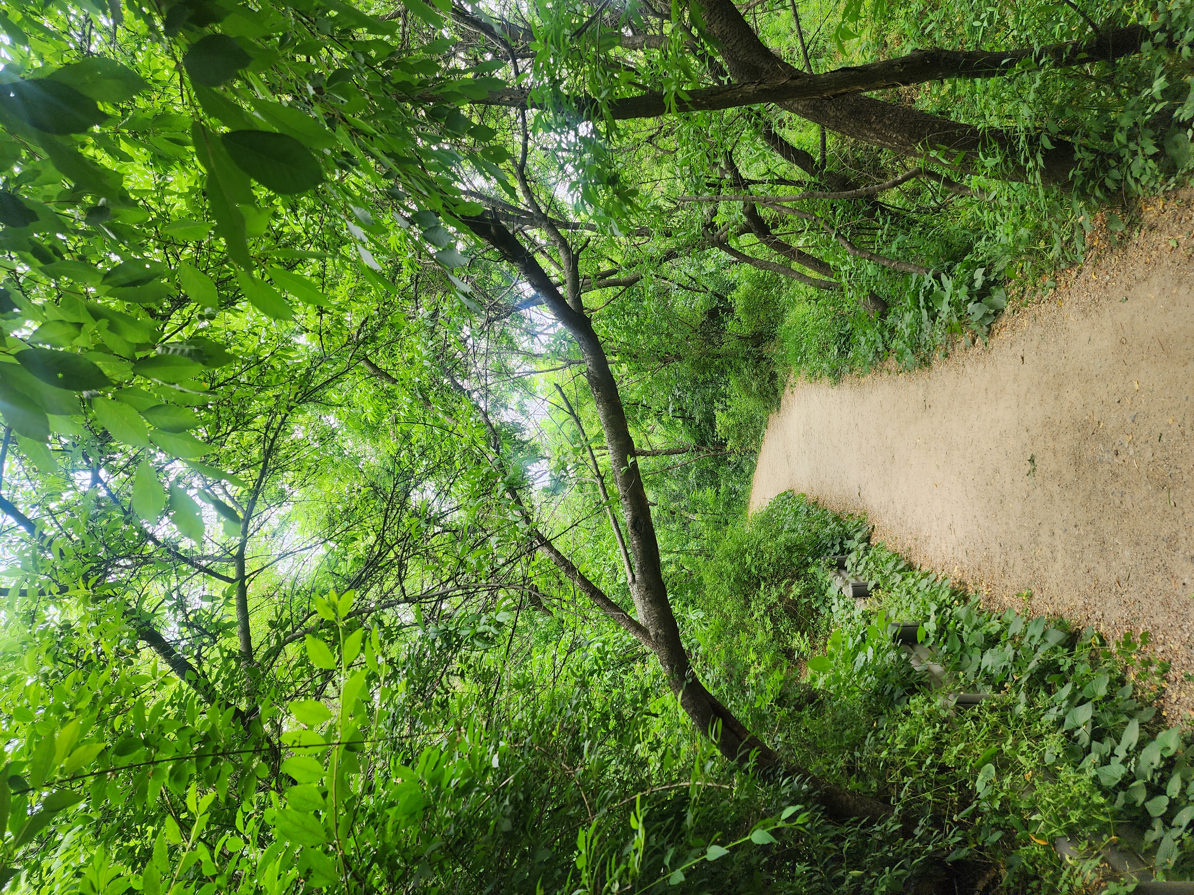 독립문역 5번 출구로 나와 서대문 형무소->임시정부기념관->한성과학고 방면으로 가다 보면 안산자락길 입구가 보인다. 계단을 오르자 울창한 숲이 모습을 드러냈다. 초입에는 아카시아 나무가 꽤 많이 있었다. 이미 꽃은 지고 푸른 나뭇잎만 무성했다. 5월에 왔으면 아카시아 꽃 향기 가득한 꽃길을 걸어 볼 수 있었을 텐데 왠지 아쉬웠다. 내년 5월 꽃피는 시기에 꼭 다시 와봐야겠다.