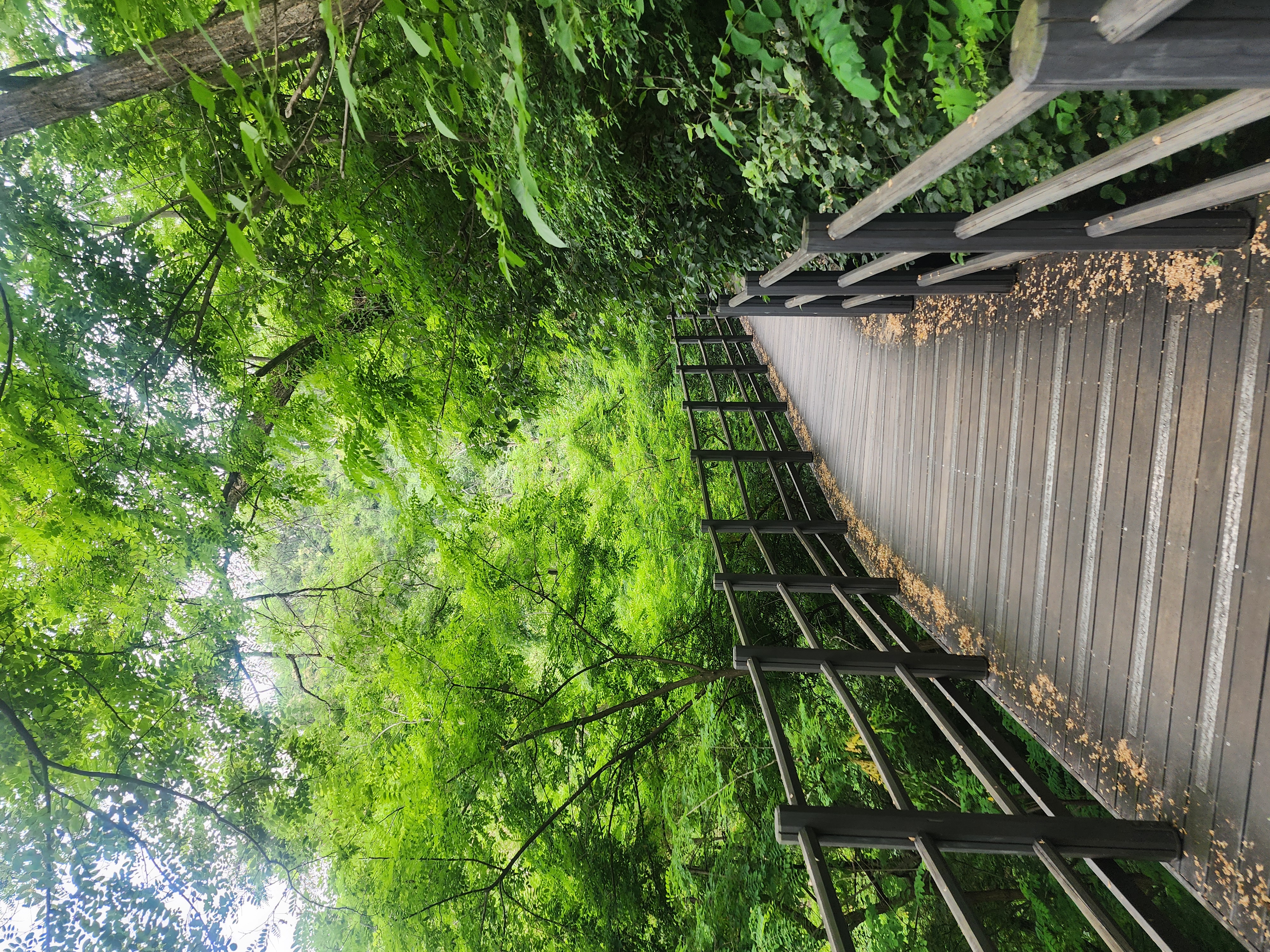 데크길을 따라 조금씩 올라갈 때마다 도심 속 소음은 사라지고 더욱 울창해진 숲이 나타나 여기가 강원도 인가하는 착각이 들었다. 도심 속에 이런 숲이 있다니 신비롭기까지 했다. 특히나 메타세쿼이아 숲에 도착했을 땐 감탄이 절로 나왔다. 한참을 바라보며 숲을 감상했다. 살랑살랑 부는 바람에 시원하게 쭉 뻗은 나무들이 흔들리며 삐그덕 소리가 난다. 한참을 앉아 있어도 지루하지 않았다. 고요하며 마음이 편안해졌다. 자연을 흠뻑 즐기고 있는데 아이가 그만 가자며 초치는 소리를 한다. 그래.. 가자