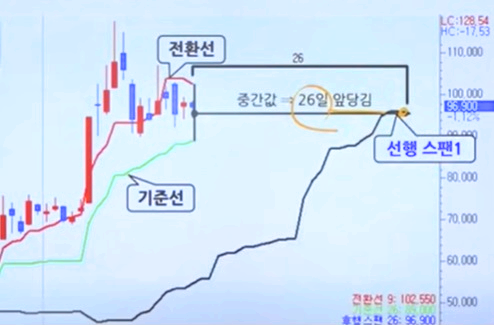 현재를 포함해 과거 52일 동안의 최고가와 최저가의 중간값을 26일 선행시켜 날마다 이은 선이다.